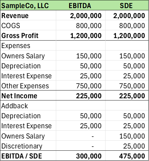 SDE stands for Seller’s Discretionary Earnings. It’s basically EBITDA, plus the owner’s total benefit from the business—salary, perks, and any personal expenses run through the business.