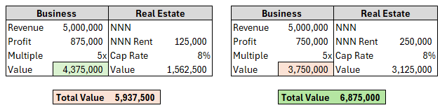 - Total Value: The value of business + real estate increased overall, since each dollar of cashflow shifted towards the real estate is more valuable than cashflow removed from the business.