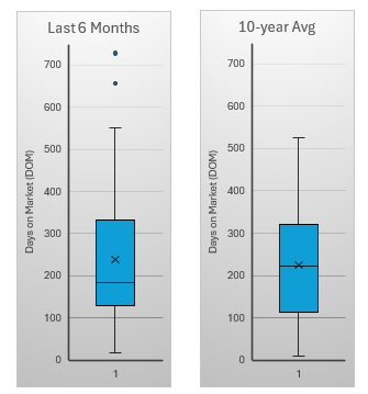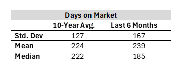 Listings are closing faster than historical norms. Median DOM has sped up to 185 days – about 17% faster than the 10-year median – a clear “hot” signal. Yet the mean DOM remains above the benchmark, pointing to a small but notable group slower moving businesses. On average, most businesses are moving quickly, while others may be dragging.