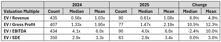 Multiples tell an interesting story: Median EBITDA and SDE are largely flat, with EBITDA down a tick from 4.1x in 2024, to 4.0x in 2025. However, all other measurable metrics are up including EBITDA mean jumping 10% to 6.6x in 2025 (up from 6.0x in 2024), reflecting a handful of standout deals commanding substantial premiums. Revenue multiples are modestly up in 2025 (median 0.61x vs. 0.56x in 2024), showing steady interest relative to top-line performance.
